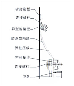 二次密封主要有彈性壓板、異型連接板、防蒸發(fā)隔膜以及耐油、耐氣候老化、耐磨的復合橡膠密封刮板組成。它能有效的防止油氣泄漏,阻擋雨水、風沙向罐內(nèi)滲入,以能隨浮盤升降運行自如而不發(fā)生翹曲;防蒸發(fā)隔膜具有良好的防油所蒸發(fā)滲透,它整條地環(huán)繞在浮盤與罐壁的環(huán)行窨上,外部受彈性壓板保護,能將一次密封泄漏的油氣與大氣空間有效的隔離。 |